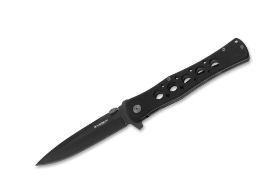 The Magnum Power Ranger presents a sleek, long pocket design complemented by a G10 skeleton handle for optimal grip. The black-coated 440A blade is easily accessed with a thumb disc or flipper and locked into place with a sturdy linerlock. A subtle clip allows for discreet carry.