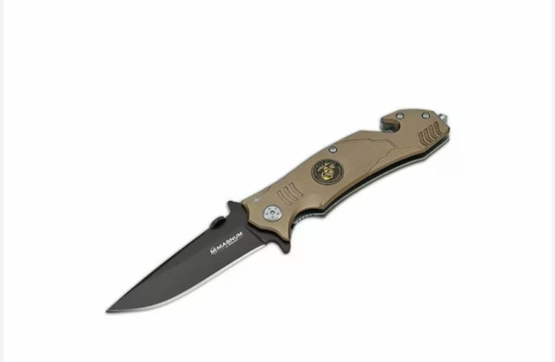 This US Marine-inspired rescue knife features an eagle, globe, and anchor crest. The 440 stainless steel blade, coated in black for durability, can be swiftly deployed with one hand in emergency situations. The liner lock ensures stable positioning. Additional features include an ice breaker and belt cutter for multipurpose use.
